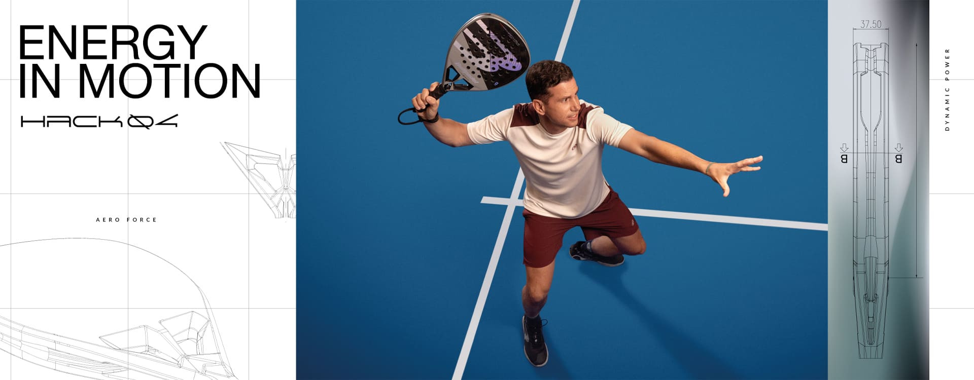 Le HACK 04 dépasse les attentes en introduisant le concept de puissance dynamique . La clé réside dans l'optimisation de la vitesse générée par les mouvements du joueur, transformant l'énergie cinétique en impacts puissants et précis. Son aérodynamisme a été méticuleusement peaufiné pour optimiser la vitesse de swing grâce à l'introduction d'un canal sur tout le périmètre du cadre. Son objectif ? Minimiser au maximum la résistance à l'air grâce au système Air React Channel . Ce canal périphérique améliore également la stabilité en torsion et la rigidité du cadre, optimisant le transfert d'énergie à chaque coup. Avec le nouveau HACK 04, vous ressentirez une accélération rapide et la transformerez en coups puissants.